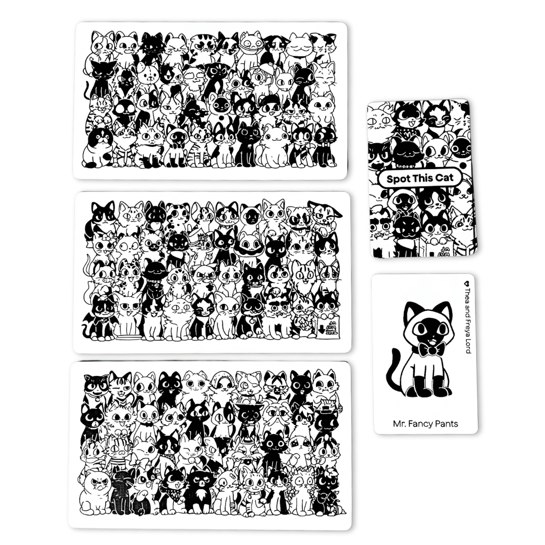 Only2availableCat Spotting is a fun and fast series of games where the objective is simple: be the first player to spot the hidden cat in the crowd! These games are best played with 2 players, but can be enjoyed with more.