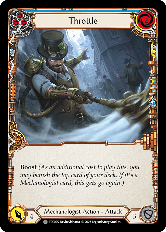 Only0availableSet: Round the Table: TCC x LSS Finish: Regular Type: Action Subtype: Attack Rarity: Common Class: Mechanologist Cost: 2 Power: 4 Boost (As an additional cost to play this, you may banish the top card of your deck. If it's a Mechanologist card, this gets go again.)REFUND AND RETURNS POLICY