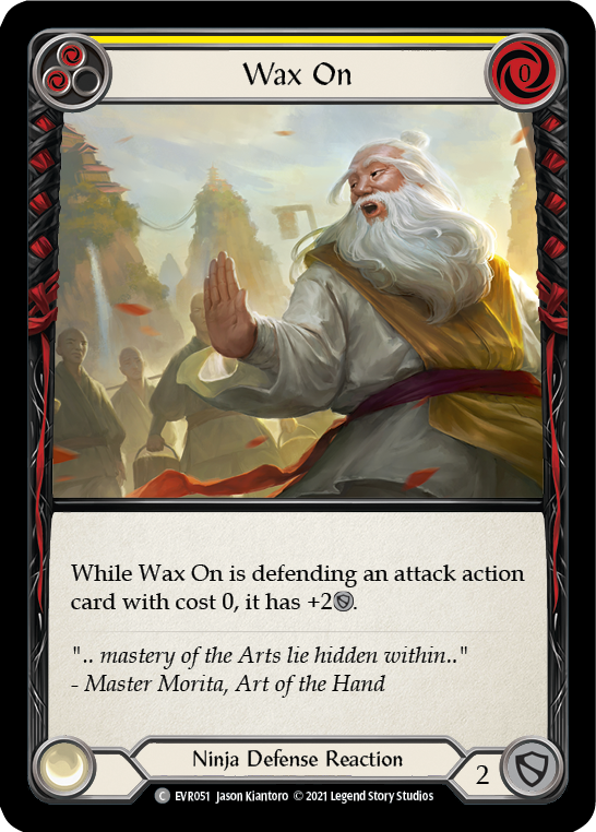 Only0availableSet: Everfest Edition: 1st Edition Finish: Regular Type: Defense Reaction Rarity: Common Class: Ninja Cost: 0 While Wax On is defending an attack action card with cost 0, it gains +2[Defense].REFUND AND RETURNS POLICY