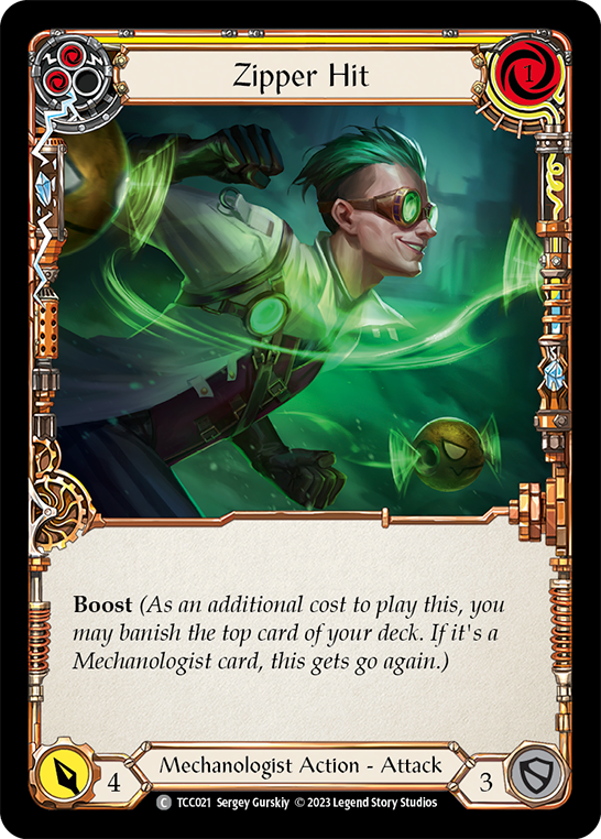 Only0availableSet: Round the Table: TCC x LSS Finish: Regular Type: Action Subtype: Attack Rarity: Common Class: Mechanologist Cost: 1 Power: 4 Boost (As an additional cost to play this, you may banish the top card of your deck. If it's a Mechanologist card, this gets go again.)REFUND AND RETURNS POLICY